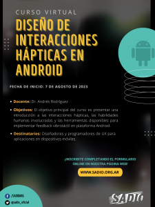 Objetivos: El objetivo principal del curso es presentar una introducción a las interacciones hápticas, las habilidades humanas involucradas y las herramientas disponibles para implementar feedback vibrotáctil en plataforma Android.